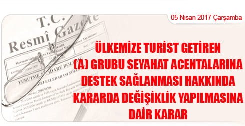 ÜLKEMİZE TURİST GETİREN (A) GRUBU SEYAHAT ACENTALARINA DESTEK SAĞLANMASI HAKKINDA KARARDA DEĞİŞİKLİK YAPILMASINA DAİR KARAR