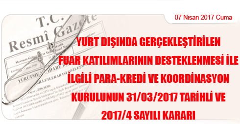 Yurt Dışında Gerçekleştirilen Fuar Katılımlarının Desteklenmesi ile İlgili Para-Kredi ve Koordinasyon Kurulunun 31/03/2017 Tarihli ve 2017/4 Sayılı Kararı