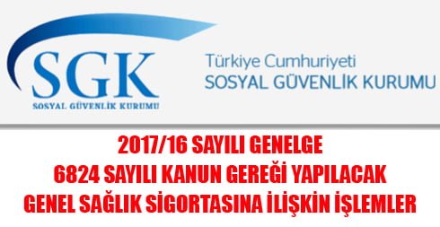 8.3.2017 tarihli ve 30001 sayılı Resmi Gazete’de yayımlanan “6824 sayılı Bazı Alacakların Yeniden Yapılandırılması ile Bazı Kanun ve Kanun Hükmünde Kararnamelerde Değişiklik Yapılmasına Dair Kanun” ile 1.4.2017 tarihinde yürürlüğe girmek üzere 5510 sayılı Kanunun 60., 61., 80., 81. maddelerinde yapılan değişiklikler ve Kanuna eklenen geçici 73. madde ile genel sağlık sigortası uygulamalarına ilişkin değişiklikler yapılmıştır. Ayrıca, Kanuna eklenen ek 13. madde ile ülkemizde ikamet eden Türk vatandaşlarının ülkemizde ikamet etmeyen Türk soylu aile fertlerinin ve 6735 sayılı Uluslararası İşgücü Kanunun 13. ve 16. maddeleri kapsamında ülkemizde çalışma izni muafiyeti bulunan Türk soylu yabancıların genel sağlık sigortası kapsamına alınmasına ilişkin düzenlemeler yapılmıştır.