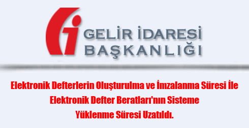02 Mayıs 2017 günü sonuna kadar oluşturulması ve imzalanması gereken e-Defterlerin oluşturulma ve imzalanma süresi ile aynı sürede Gelir İdaresi Başkanlığı Bilgi İşlem Sistemine yüklenmesi gereken “Elektronik Defter Beratları”nın yüklenme süresi 31 Mayıs 2017 günü sonuna kadar uzatılmıştır.