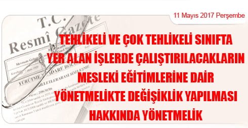 Home»Haberler»Tehlikeli ve Çok Tehlikeli Sınıfta Yer Alan İşlerde Çalıştırılacakların Mesleki Eğitimlerine Dair Yönetmelikte Değişiklik Yapılması Hakkında Yönetmelik