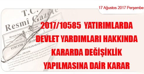 2017/10585 Yatırımlarda Devlet Yardımları Hakkında Kararda Değişiklik Yapılmasına Dair Karar