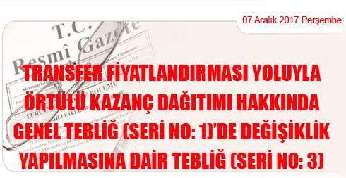 Transfer Fiyatlandırması Yoluyla Örtülü Kazanç Dağıtımı Hakkında Genel Tebliğ (Seri No: 1)’de Değişiklik Yapılmasına Dair Tebliğ (Seri No: 3)