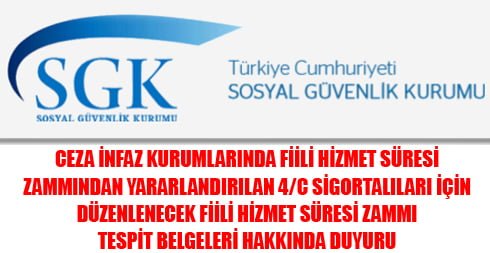 5434 SAYILI KANUNUN 40 INCI MADDESİNİN İKİNCİ FIKRASININ 19 UNCU BENDİ GEREĞİNCE CEZA İNFAZ KURUMLARINDA FİİLİ HİZMET SÜRESİ ZAMMINDAN YARARLANDIRILAN 4/C SİGORTALILARI İÇİN DÜZENLENECEK FİİLİ HİZMET SÜRESİ ZAMMI TESPİT BELGELERİ HAKKINDA DUYURU