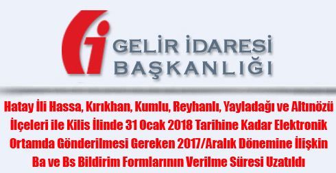 Hatay İli Hassa, Kırıkhan, Kumlu, Reyhanlı, Yayladağı ve Altınözü İlçeleri ile Kilis İlindeki mükellefler tarafından 31 Ocak 2018 tarihine kadar verilmesi gereken 2017/Aralık dönemine ilişkin “Form Ba” ve “Form Bs” bildirimlerinin verilme süresi 28 Şubat 2018 günü sonuna kadar uzatılmıştır.