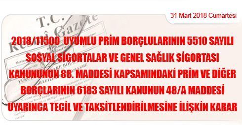 Uyumlu prim borçlularının 5510 sayılı Sosyal Sigortalar ve Genel Sağlık Sigortası Kanununun 88 inci maddesi kapsamındaki prim ve diğer borçlarının 6183 sayılı Kanunun 48/A maddesi uyarınca tecil ve taksitlendirilmesine ilişkin ekli Kararın yürürlüğe konulması; Çalışma ve Sosyal Güvenlik Bakanlığının 5/3/2018 tarihli ve 2995608 sayılı yazısı üzerine, 5510 sayılı Kanunun 88 inci maddesine göre, Bakanlar Kurulu’nca 5/3/2018 tarihinde kararlaştırılmıştır.