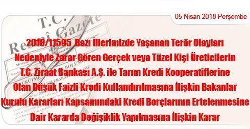 Bazı illerimizde yaşanan terör olayları nedeniyle zarar gören gerçek veya tüzel kişi üreticilerin T.C. Ziraat Bankası A.Ş. ile Tarım Kredi Kooperatiflerine olan düşük faizli kredi kullandırılmasına ilişkin Bakanlar Kurulu kararlan kapsamındaki kredi borçlarının ertelenmesine dair Kararda değişiklik yapılması hakkındaki ekli Kararın yürürlüğe konulması; Başbakan Yardımcılığı (Hazine Müsteşarlığının 29/3/2018 tarihli ve 8820 sayılı yazısı üzerine, 15/11/2000 tarihli ve 4603 sayılı Kanunun 3 üncü maddesi ile 27/12/2006 tarihli ve 5570 sayılı Kanunun 1 inci maddesine göre, Bakanlar Kurulu’nca 30/3/2018 tarihinde kararlaştırılmıştır.