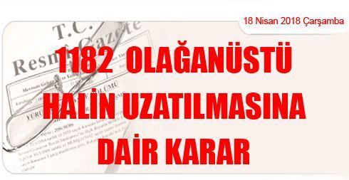 Anayasanın 120’nci maddesi ile 2935 sayılı Olağanüstü Hal Kanunu’nun 3’üncü maddesinin birinci fıkrasının (b) bendine göre, ülke genelinde devam etmekte olan olağanüstü halin, 19.04.2018 Perşembe günü saat 01.00’dan geçerli olmak üzere 3 ay süre ile uzatılması hakkında Bakanlar Kurulunca 17.04.2018 tarihinde alınan Karar, Türkiye Büyük Millet Meclisi Genel Kurulunun 18.04.2018 tarihli 87’nci Birleşiminde onaylanmıştır.