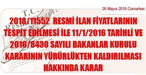 Resmi ilan fiyatlarının ekli tarifede gösterildiği şekilde tespit edilmesi ile 11.1.2016 tarihli ve 2016/8430 sayılı Bakanlar Kurulu Kararının yürürlükten kaldırılması; Basın İlan Kurumu Genel Kurulunun teklifine dayanan Başbakan Yardımcılığının 26.3.2018 tarihli ve 22139 sayılı yazısı üzerine, 2.1.1961 tarihli ve 195 sayılı Kanunun 39. maddesine göre, Bakanlar Kurulu’nca 26.3.2018 tarihinde kararlaştırılmıştır.