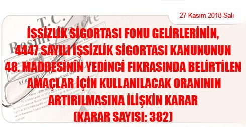 İşsizlik Sigortası Fonu gelirlerinin, 4447 sayılı İşsizlik Sigortası Kanununun 48. maddesinin yedinci fıkrasında belirtilen amaçlar için kullanılacak oranının artırılmasına ilişkin ekli Kararın yürürlüğe konulmasına, anılan Kanunun 48. maddesi gereğince karar verilmiştir,