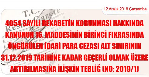 MADDE 1 – (1) 7.12.1994 tarihli ve 4054 sayılı Rekabetin Korunması Hakkında Kanunun 16. maddesinin birinci fıkrasında düzenlenmiş olan idari para cezası alt sınırı, 30.11.2018 tarihli ve 30611 sayılı Resmî Gazete’de yayımlanan Vergi Usul Kanunu Genel Tebliği (Sıra No: 503)’nde tespit edilen 2018 yılı için yeniden değerleme oranı olan % 23,73 (yirmiüç virgül yetmişüç) artış esas alınarak, 1.1.2019 tarihinden 31.12.2019 tarihine kadar geçerli olmak üzere 26.028 TL (yirmialtıbinyirmisekizlira) olarak belirlenmiştir.