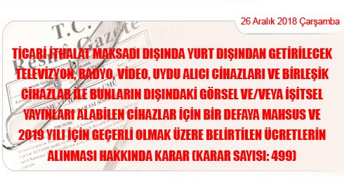 Ticari ithalat maksadı dışında yurt dışından getirilecek televizyon, radyo, video, uydu alıcı cihazları ve birleşik cihazlar ile bunların dışındaki görsel ve/veya işitsel yayınları alabilen cihazlar için bir defaya mahsus ve 2019 yılı için geçerli olmak üzere ekli listede belirtilen ücretlerin alınmasına, 4.12.1984 tarihli ve 3093 sayılı Kanunun 4. maddesi gereğince karar verilmiştir.