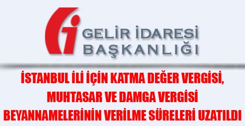 İstanbul ilindeki mükellefler tarafından, 26 Eylül 2019 günü sonuna kadar verilmesi gereken Muhtasar Beyannameler, Damga Vergisi Beyannameleri ve Katma Değer Vergisi Beyannamelerinin verilme süreleri ile bu beyannameler üzerine tahakkuk eden vergilerin ödeme süreleri 30 Eylül 2019 Pazartesi günü sonuna kadar uzatılmıştır.