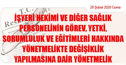 MADDE 1 – 20/7/2013 tarihli ve 28713 sayılı Resmî Gazete’de yayımlanan İşyeri Hekimi ve Diğer Sağlık Personelinin Görev, Yetki, Sorumluluk ve Eğitimleri Hakkında Yönetmeliğin 4 üncü maddesinin birinci fıkrasının (h) bendi aşağıdaki şekilde değiştirilmiştir.