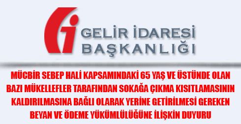 MÜCBİR SEBEP HALİ KAPSAMINDAKİ 65 YAŞ VE ÜSTÜNDE OLAN BAZI MÜKELLEFLER TARAFINDAN SOKAĞA ÇIKMA KISITLAMASININ KALDIRILMASINA BAĞLI OLARAK YERİNE GETİRİLMESİ GEREKEN BEYAN VE ÖDEME YÜKÜMLÜLÜĞÜNE İLİŞKİN DUYURU