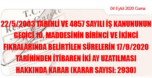 22/5/2003 Tarihli ve 4857 Sayılı İş Kanununun Geçici 10 uncu Maddesinin Birinci ve İkinci Fıkralarında Belirtilen Sürelerin 17/9/2020 Tarihinden İtibaren İki Ay Uzatılması Hakkında Karar (Karar Sayısı: 2930)
