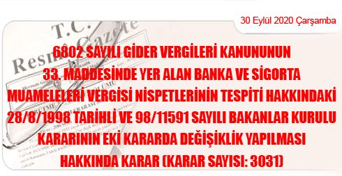6802 Sayılı GVK 33. Mad. Yer Alan Banka ve Sigorta Muameleleri Vergisi Nispetlerinin Tespiti Hak. 28/8/1998 Tarihli ve 98/11591 Sayılı BKK Eki Kararda Değişiklik Yapılması Hakkında Karar Sayısı:3031