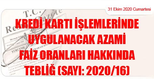 GEÇİCİ MADDE 1 – (1) 23/10/2020 tarihinde Türkiye Cumhuriyet Merkez Bankasınca ilan edilen referans oran üzerinden bu Tebliğ hükümleri çerçevesinde hesaplanan azami akdi ve gecikme faiz oranları 1/11/2020 tarihinden itibaren geçerlidir. Söz konusu oranların uygulanmaya başlanacağı tarihe kadar ise bu Tebliğin 8 inci maddesi ile yürürlükten kaldırılan Kredi Kartı İşlemlerinde Uygulanacak Azami Faiz Oranları Hakkında Tebliğ (Sayı: 2016/8)’de belirlenen oranlar uygulanır.