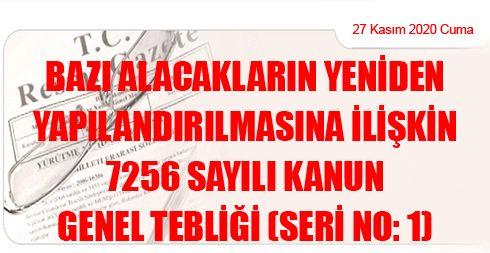 11.11.2020 tarihli ve 7256 sayılı Bazı Alacakların Yeniden Yapılandırılması ile Bazı Kanunlarda Değişiklik Yapılması Hakkında Kanun 17.11.2020 tarihli ve 31307 sayılı Resmi Gazete’de yayımlanmış ve bazı alacakların yapılandırılmasına ilişkin hükümleri yayımı tarihinde yürürlüğe girmiştir.