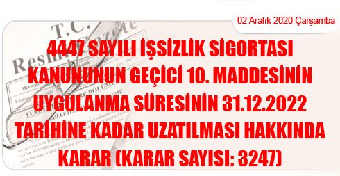 4447 sayılı İşsizlik Sigortası Kanununun geçici 10. maddesinin uygulanma süresinin 31.12.2022 tarihine kadar uzatılmasına, 4447 sayılı Kanunun geçici 10. maddesinin onikinci fıkrası gereğince karar verilmiştir.