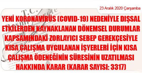 Yeni koronavirüs (Covid-19) nedeniyle dışsal etkilerden kaynaklanan dönemsel durumlar kapsamındaki zorlayıcı sebep gerekçesiyle kısa çalışma uygulanan işyerleri için kısa çalışma ödeneğinin süresinin uzatılması hakkındaki ekli Kararın yürürlüğe konulmasına, 4447 sayılı İşsizlik Sigortası Kanununun geçici 23. maddesi gereğince karar verilmiştir.