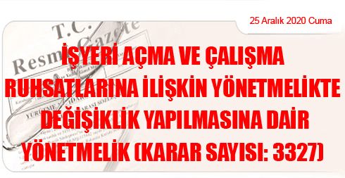 İşyeri Açma ve Çalışma Ruhsatlarına İlişkin Yönetmelikte Değişiklik Yapılmasına Dair Yönetmelik (Karar Sayısı: 3327)