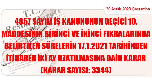 4857 sayılı İş Kanununun geçici 10 uncu maddesinin birinci ve ikinci fıkralarında belirtilen sürelerin 17/1/2021 tarihinden itibaren iki ay uzatılmasına, mezkûr Kanunun geçici 10 uncu maddesinin dördüncü fıkrası gereğince karar verilmiştir.