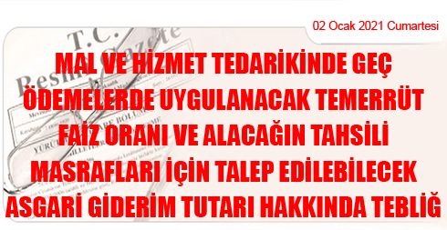13.01.2011 tarihli ve 6102 sayılı Türk Ticaret Kanununun 1530. maddesinin yedinci fıkrası uyarınca mal ve hizmet tedarikinde alacaklıya yapılan geç ödemelere ilişkin temerrüt faiz oranının sözleşmede öngörülmediği veya ilgili hükümlerin geçersiz olduğu hallerde uygulanacak faiz oranı yıllık yüzde 18,25 alacağın tahsili masrafları için talep edilebilecek asgari giderim tutan 385,00 Türk Lirası olarak tespit edilmiştir.