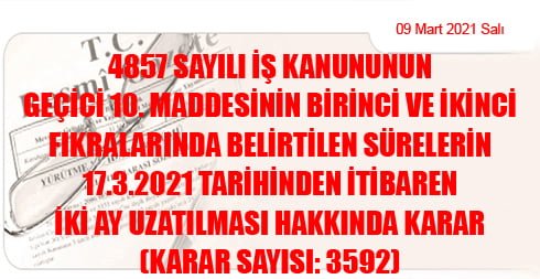 4857 sayılı İş Kanununun geçici 10. maddesinin birinci ve ikinci fıkralarında belirtilen sürelerin 17.3.2021 tarihinden itibaren iki ay uzatılmasına, mezkûr Kanunun geçici 10. maddesinin dördüncü fıkrası gereğince karar verilmiştir.