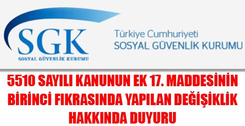 5510 SAYILI KANUNUN EK 17. MADDESİNİN BİRİNCİ FIKRASINDA YAPILAN DEĞİŞİKLİK HAKKINDA DUYURU