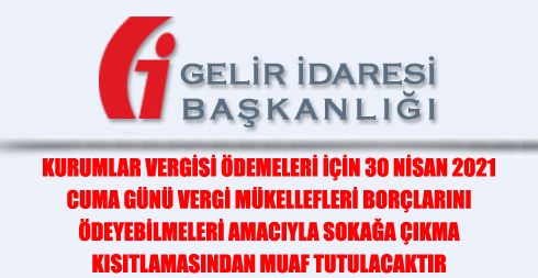 KURUMLAR VERGİSİ ÖDEMELERİ İÇİN 30 NİSAN 2021 CUMA GÜNÜ VERGİ MÜKELLEFLERİ BORÇLARINI ÖDEYEBİLMELERİ AMACIYLA SOKAĞA ÇIKMA KISITLAMASINDAN MUAF TUTULACAKTIR