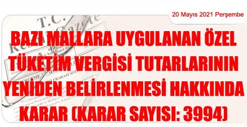 Bazı mallara uygulanan özel tüketim vergisi tutarlarının yeniden belirlenmesine dair ekli Kararın yürürlüğe konulmasına, 4760 sayılı Özel Tüketim Vergisi Kanununun 12. maddesi gereğince karar verilmiştir.