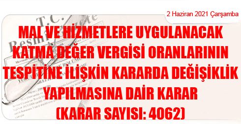 Mal ve Hizmetlere Uygulanacak Katma Değer Vergisi Oranlarının Tespitine İlişkin Kararda Değişiklik Yapılmasına Dair Karar (Karar Sayısı: 4062)