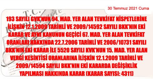 29.7.2021 TARİHLİ VE 4311 SAYILI CUMHURBAŞKANI KARARININ EKİ