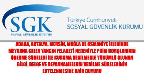 ADANA, ANTALYA, MERSİN, MUĞLA VE OSMANİYE İLLERİNDE MEYDANA GELEN YANGIN FELAKETİ NEDENİYLE PRİM BORÇLARININ ÖDENME SÜRELERİ İLE KURUMA VERİLMEKLE YÜKÜMLÜ OLUNAN BİLGİ, BELGE VE BEYANNAMELERİN VERİLME SÜRELERİNİN ERTELENMESİNE DAİR DUYURU