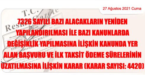 MADDE 1- (1) 3/6/2021 tarihli ve 7326 sayılı Bazı Alacakların Yeniden Yapılandırılması ile Bazı Kanunlarda Değişiklik Yapılmasına İlişkin Kanunun 2 nci, 3 üncü, 4 üncü, 5 inci, 6 ncı, 7 nci ve 8 inci maddeleri ile 10 uncu maddesinden (altıncı ve yedinci fıkraları hariç) yararlanmak için öngörülen ve 31/8/2021 tarihinde sona erecek olan başvuru, bildirim ve beyan süreleri ile bu başvuru, bildirim ve beyana ilişkin ilk taksit ödeme süreleri, 10 uncu maddenin dördüncü fıkrasında yer alan başvuru ve ilk taksit ödeme süresi birer ay uzatılmıştır.
