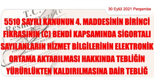 MADDE 1 – 14/4/2012 tarihli ve 28264 sayılı Resmî Gazete’de yayımlanan 5510 sayılı Kanunun 4 üncü Maddesinin Birinci Fıkrasının (c) Bendi Kapsamında Sigortalı Sayılanların Hizmet Bilgilerinin Elektronik Ortama Aktarılması Hakkında Tebliğ yürürlükten kaldırılmıştır.
