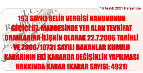 15.12.2021 TARİHLİ VE 4921 SAYILI CUMHURBAŞKANI KARARININ EKİ