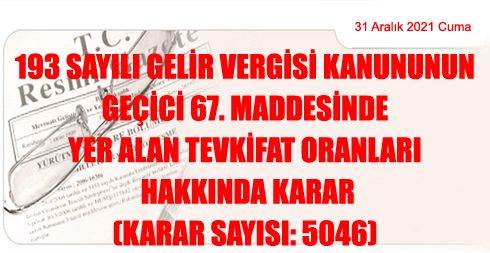193 Sayılı Gelir Vergisi Kanununun Geçici 67. Maddesinde Yer Alan Tevkifat Oranları Hakkında Karar (Karar Sayısı: 5046)