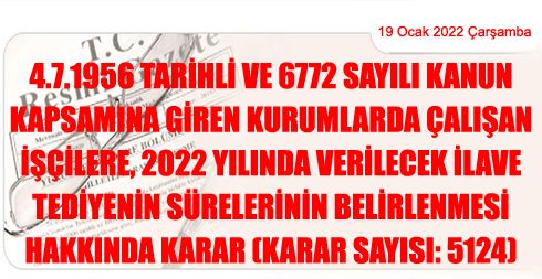 1- 4.7.1956 tarihli ve 6772 sayılı Kanun kapsamına giren kurumlarda çalışan işçilere 2022 yılında, mezkûr Kanunun 1. maddesine göre yapılacak ilave tediyenin birinci yarısının 28.1.2022, diğer yarısının 29.4.2022 tarihinde ödenmesine,