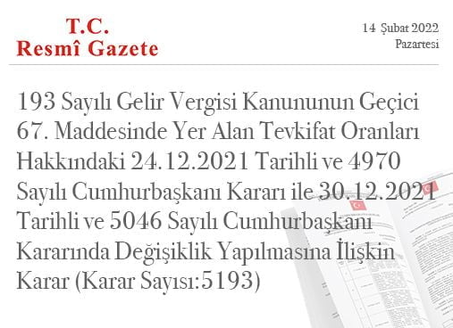 193 Sayılı Gelir Vergisi Kanununun Geçici 67. Maddesinde Yer Alan Tevkifat Oranları Hakkındaki 24.12.2021 Tarihli ve 4970 Sayılı Cumhurbaşkanı Kararı ile 30.12.2021 Tarihli ve 5046 Sayılı Cumhurbaşkanı Kararında Değişiklik Yapılmasına İlişkin Karar (Karar Sayısı:5193)