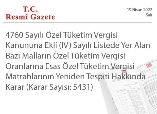 4760 sayılı Özel Tüketim Vergisi Kanununa ekli (IV) sayılı listede yer alan bazı malların özel tüketim vergisi oranlarına esas özel tüketim vergisi matrahlarının yeniden tespiti hakkındaki ekli Kararın yürürlüğe konulmasına, mezkûr Kanunun 12. maddesi gereğince karar verilmiştir.