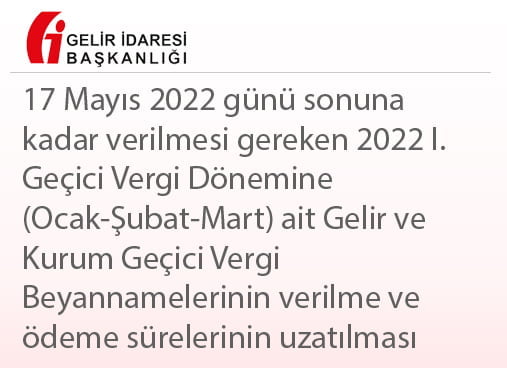 Konusu: 17 Mayıs 2022 günü sonuna kadar verilmesi gereken 2022 I. Geçici Vergi Dönemine (Ocak-Şubat-Mart) ait Gelir ve Kurum Geçici Vergi Beyannamelerinin verilme ve ödeme sürelerinin uzatılması.
