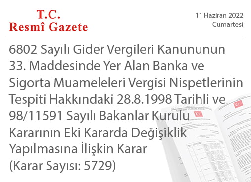 6802 Sayılı Gider Vergileri Kanununun 33. Maddesinde Yer Alan Banka ve Sigorta Muameleleri Vergisi Nispetlerinin Tespiti Hakkındaki 28/8/1998 Tarihli ve 98/11591 Sayılı Bakanlar Kurulu Kararının Eki Kararda Değişiklik Yapılmasına İlişkin Karar (Karar Sayısı: 5729)