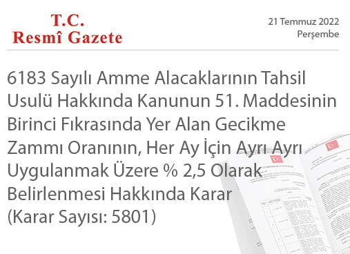 6183 Sayılı Amme Alacaklarının Tahsil Usulü Hakkında Kanunun 51. Maddesinin Birinci Fıkrasında Yer Alan Gecikme Zammı Oranının, Her Ay İçin Ayrı Ayrı Uygulanmak Üzere % 2,5 Olarak Belirlenmesi Hakkında Karar (Karar Sayısı: 5801)
