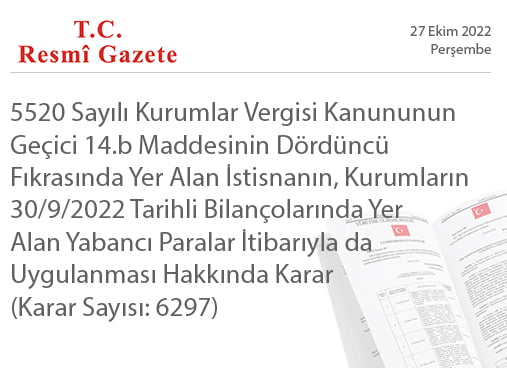 5520 Sayılı Kurumlar Vergisi Kanununun Geçici 14. Maddesinin Dördüncü Fıkrasında Yer Alan İstisnanın, Kurumların 30/9/2022 Tarihli Bilançolarında Yer Alan Yabancı Paralar İtibarıyla da Uygulanması Hakkında Karar (Karar Sayısı: 6297)