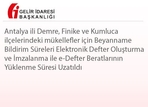 Antalya ili Demre, Finike ve Kumluca ilçelerindeki mükellefler için Beyanname Bildirim Süreleri Elektronik Defter Oluşturma ve İmzalanma ile e-Defter Beratlarının Yüklenme Süresi Uzatıldı