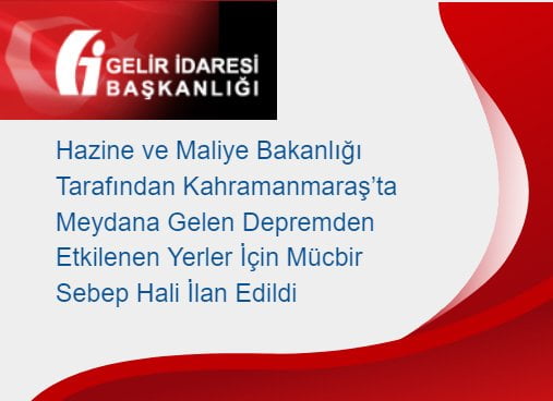 06.02.2023 tarihinde Kahramanmaraş ilinde meydana gelen deprem felaketine  ilişkin olarak, depremden etkilenen Adana, Adıyaman, Diyarbakır, Gaziantep, Hatay, Kahramanmaraş, Kilis, Malatya, Osmaniye ve Şanlıurfa illerinde Bakanlığımız tarafından, mücbir sebep hali ilan edilmesi uygun bulunmuştur.