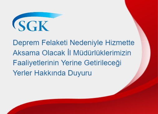 Mücbir sebep ilan edilen yerlerdeki Sosyal güvenlik il müdürlüklerimiz/merkez müdürlüklerimizde yerine getirilen işveren işlemleri, 4/b (BAĞ-KUR) ve primini kendi ödeyen sigortalı işlemleri, genel sağlık sigortası tescil ve prim işlemleri, kayıt dışı istihdamla mücadele servisi işlemleri ve sosyal güvenlik denetmen işlemleri, il müdürlüklerimiz/merkez Müdürlüklerimizde yapılmaya devam edilecektir. Ancak 06/02/2023 tarihinde Kahramanmaraş merkezli meydana gelen deprem felaketi nedeniyle Adıyaman, Hatay ve Kahramanmaraş illerindeki binalarımızda meydana gelen hasar durumu, alt yapıda oluşan aksaklıklar ve personelimizin sağlık durumları yönünden bu illerimizde yukarıda belirtilen iş ve işlemlerde aksama olabileceği değerlendirildiğinden geçici olarak, belirtilen iş ve işlemlerin başka illerde yapılması için gerekli önlemler alınmıştır.