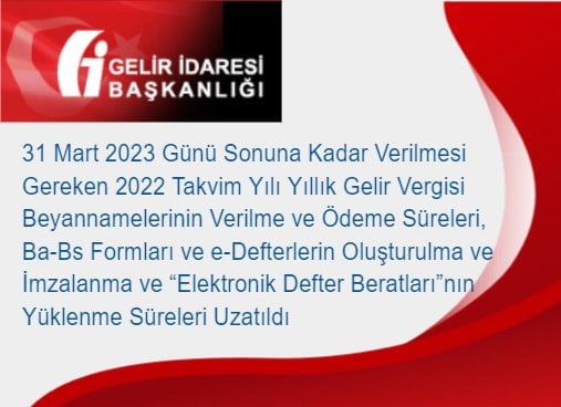 Konusu: 31 Mart 2023 günü sonuna kadar verilmesi gereken 2022 takvim yılı Yıllık Gelir Vergisi beyannamelerinin verilme süreleri ve bu beyannameler üzerine tahakkuk eden vergilerin ödeme süreleri, 31 Mart 2023 günü sonuna kadar verilmesi gereken 2023/Şubat dönemine ilişkin “Form Ba-Bs” bildirimlerinin verilme ve mezkûr tarihe kadar oluşturulması ve imzalanması gereken e-Defterlerin oluşturulma ve imzalanma ile aynı sürede Gelir İdaresi Başkanlığı Bilgi İşlem Sistemine yüklenmesi gereken “Elektronik Defter Beratları”nın yüklenme sürelerinin uzatılması.